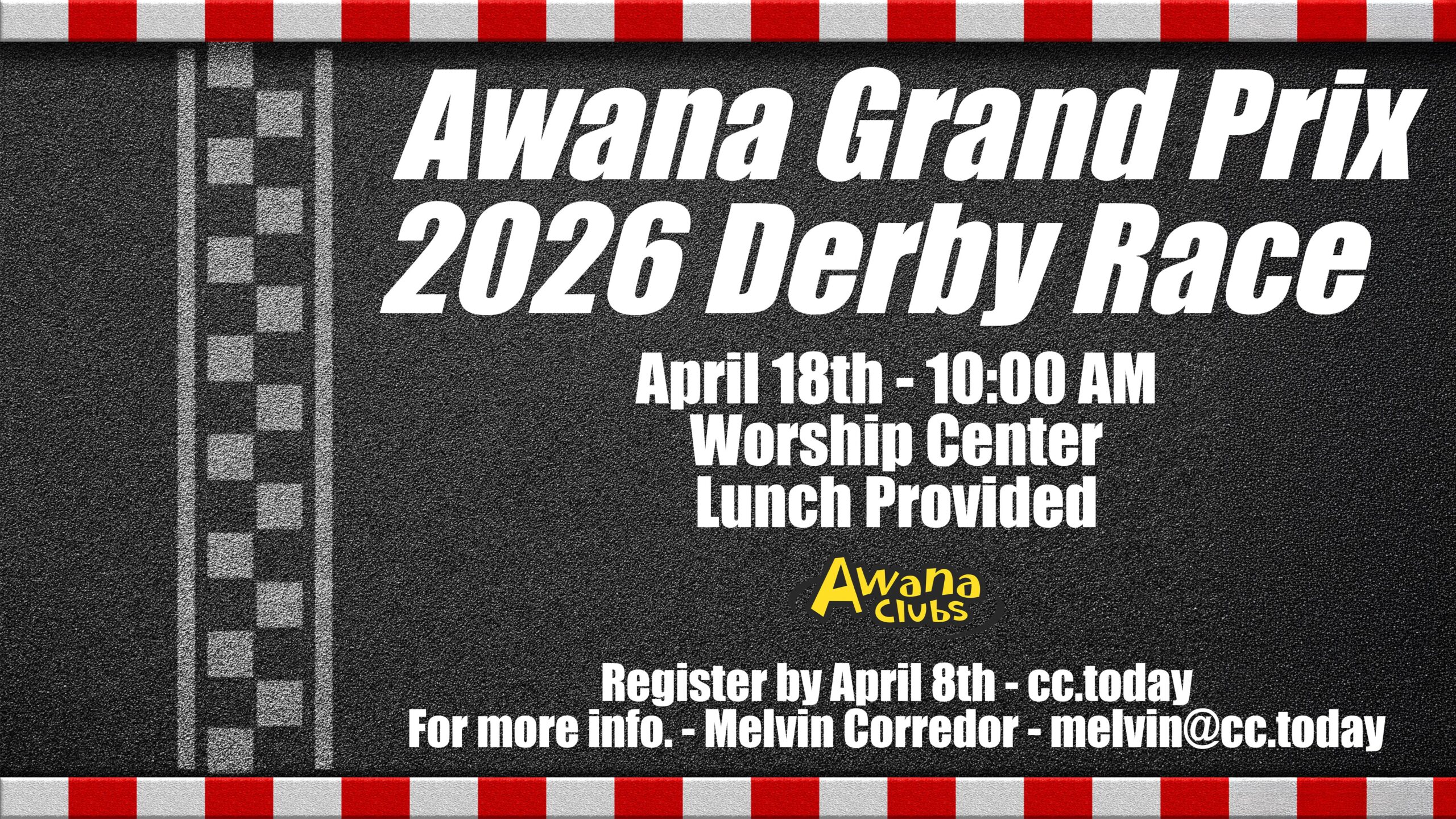 Get ready to Race!! Our Awana Club invites all clubbers and their families to this year’s Grand Prix Derby Race. It will be on Saturday, April 18th in the Worship Center.